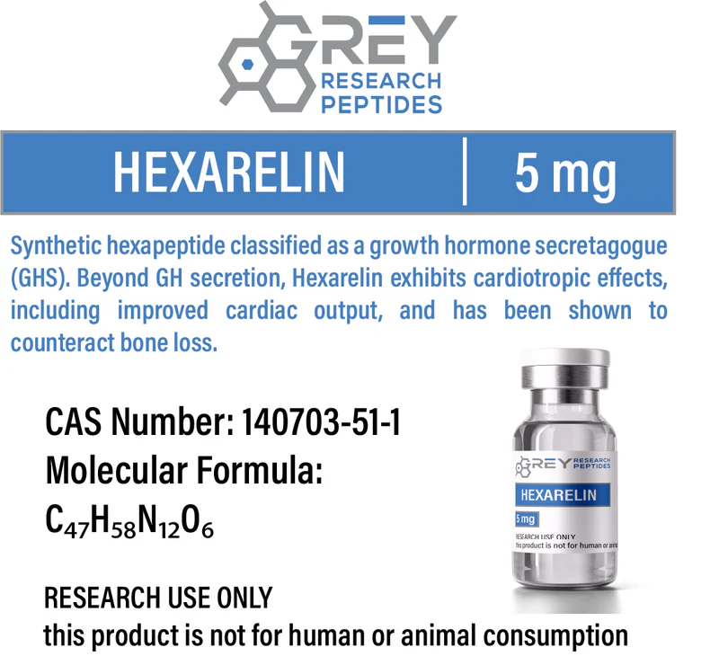 Hexarelin is a synthetic hexapeptide designed to mimic the action of endogenous ghrelin by activating the growth hormone secretagogue receptor (GHS-R1a). Unlike GHRH, Hexarelin operates via a separate receptor system, stimulating growth hormone release through hypothalamic and pituitary pathways. The peptide has been chemically modified for enhanced metabolic stability, particularly through the methylation of D-tryptophan, which resists proteolytic degradation1. Hexarelin has been investigated across diverse preclinical and clinical contexts for its ability to stimulate GH, modulate cardiac function, and influence skeletal remodeling. Its activity is short-acting but highly potent, characterized by rapid onset of GH release and quick systemic clearance. Beyond GH secretion, Hexarelin exerts direct effects on cardiac tissue by increasing left ventricular ejection fraction (LVEF) and improving myocardial performance. It also reduces bone resorption, making it a candidate for research on bone preservation in hormone-deficient states4.